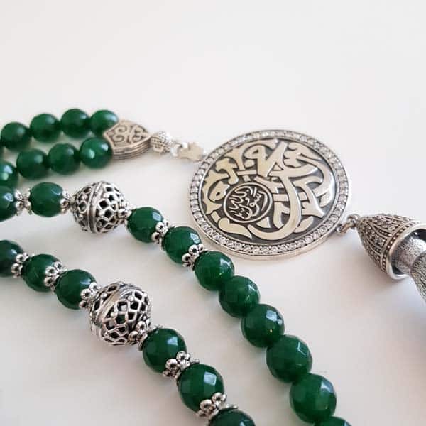 سبحة من العقيق الأخضر مصنوعة يدويا، مستوحاة من نقوش ابواب المسجد النبوي الشريف ومزينة بأحجار الزركون