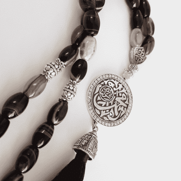 Handmade wavy agate stone prayer bead, inspired by prophet’s mosque ornaments. The charm is topped with zircon. The bottom of the charm is made of sterling silver, The lower part of the minaret is a silk threads . A great gift for your loved ones.